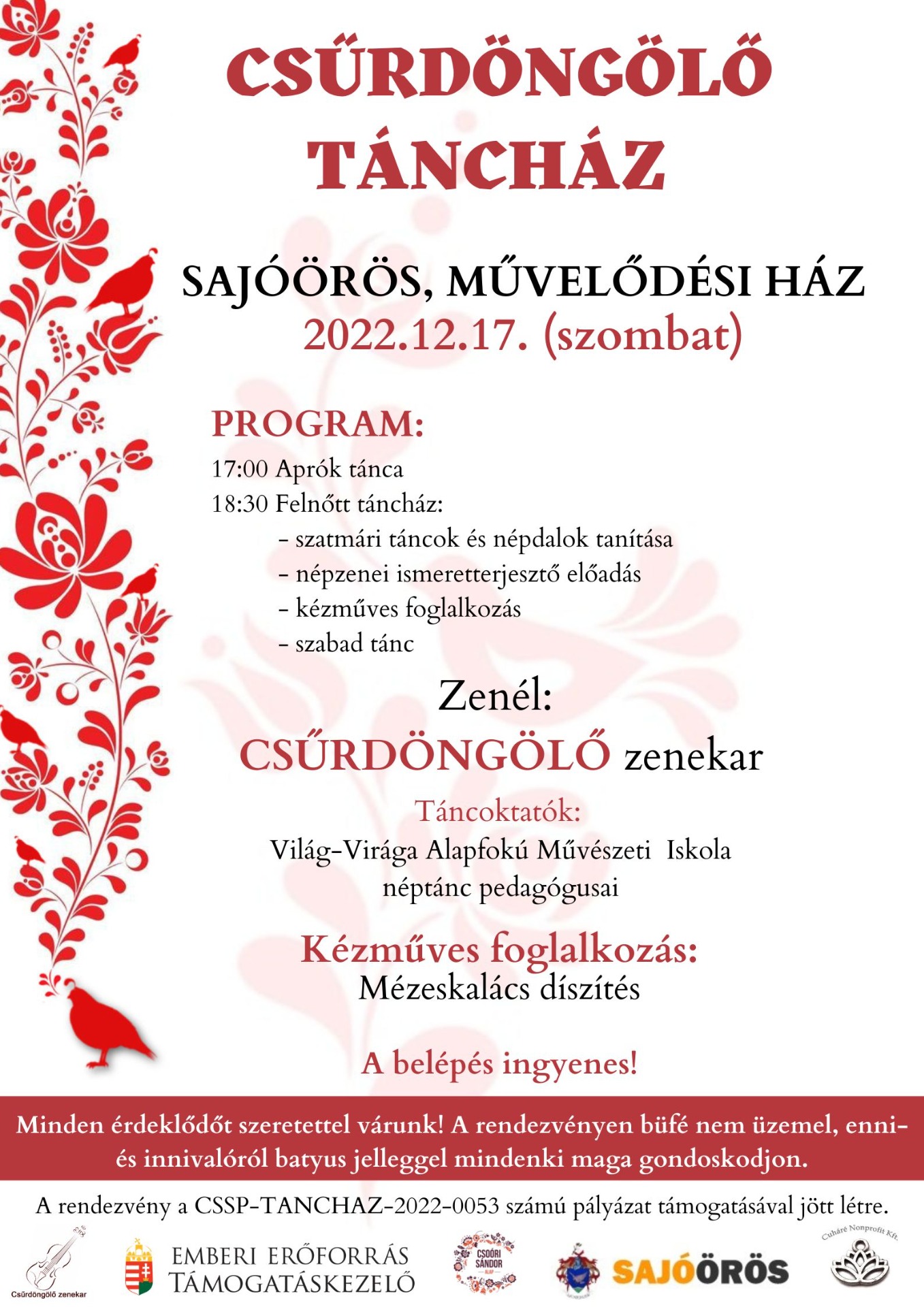 Örömmel tájékoztatjuk Önöket, hogy a tavalyi év sikere után, újra hagyományőrző táncházzal várunk minden kedves érdeklődőt a Községi Művelődési Házba! (Fő utca 16.)Az első táncház időpontja: 2022. december 17. (szombat), 17 órától
